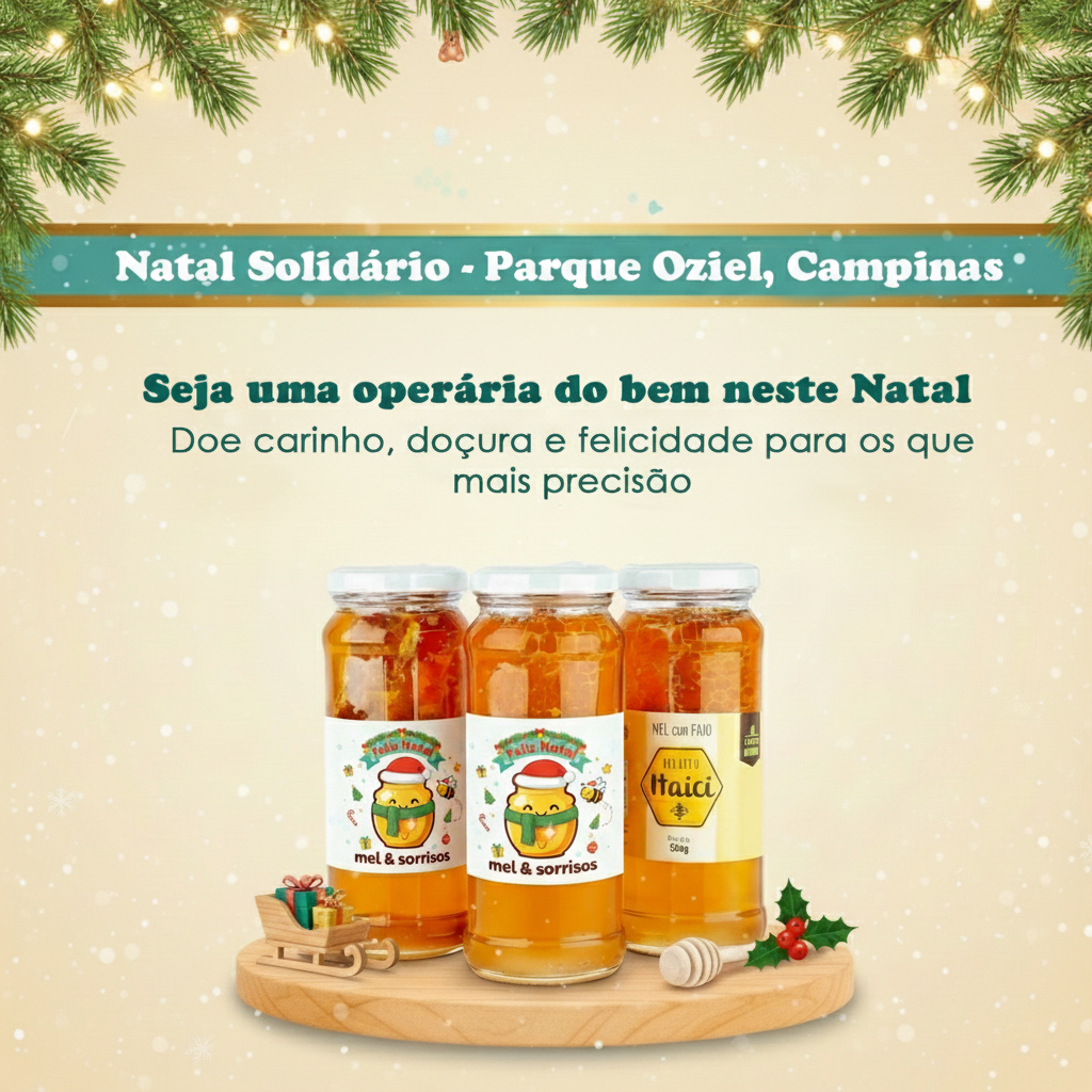 Campanha de Natal: Mel Itaici – Mel & Sorrisos de Natal Imagine um mel tão puro e delicioso que, a cada colherada, você sinta não só o sabor da natureza, mas também a magia de transformar o Natal de uma criança. Essa é a essência do Mel Itaici – Edição Mel & Sorrisos de Natal. Um Natal mais doce e solidário Acreditamos que a doçura do mel pode ir muito além do paladar. Nesta temporada especial, unimos a qualidade do nosso mel de 470g a uma causa que aquece o coração: levar sorrisos, brinquedos e momentos de alegria natalina para crianças em situação de vulnerabilidade na Região Metropolitana de Campinas. Como funciona Ao adquirir um pote do Mel Itaici “Mel & Sorrisos de Natal”, você entra na nossa corrente do bem. Parte do lucro de cada venda é voltada integralmente à compra de brinquedos e à realização de ações lúdicas e natalinas, tornando o Natal e o fim de ano mais mágico para quem mais precisa. Por que Mel & Sorrisos de Natal? Porque toda criança merece um Natal com brincadeira, sonho e sorriso no rosto. Porque a solidariedade é o ingrediente essencial para um mundo mais doce e mais justo. Porque, ao escolher nosso mel, você se torna agente dessa transformação. Mais que um mel, um gesto de amor Nosso mel de 470g é cuidadosamente produzido, garantindo a pureza e o sabor que você já conhece e confia. Agora, ele vem com um propósito ainda maior: adoçar Natais e espalhar esperança. Junte-se a nós Faça a sua parte. Adoce sua mesa de Natal e o coração de uma criança. Adquira agora o Mel Itaici – Edição Mel & Sorrisos de Natal em nosso e-commerce. Mel Itaici: Onde o sabor encontra a solidariedade. Um pote de mel, um Natal mais feliz.